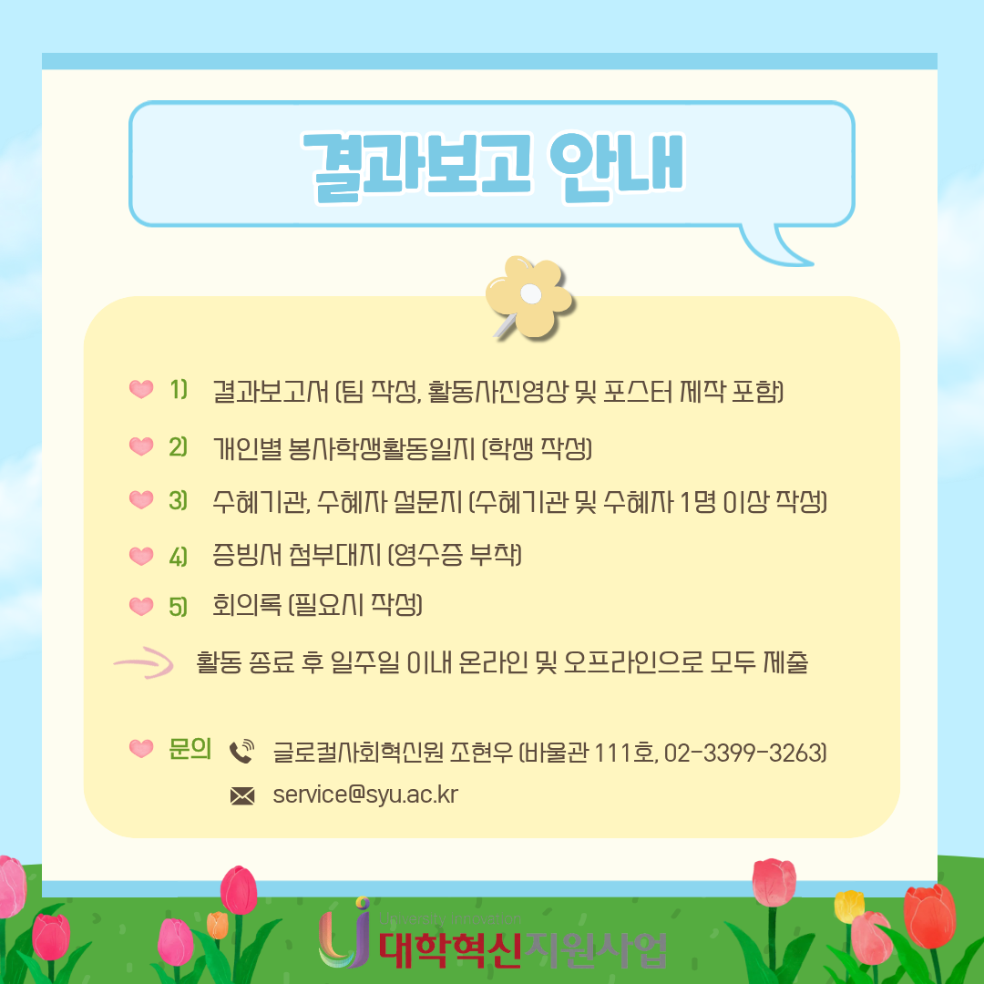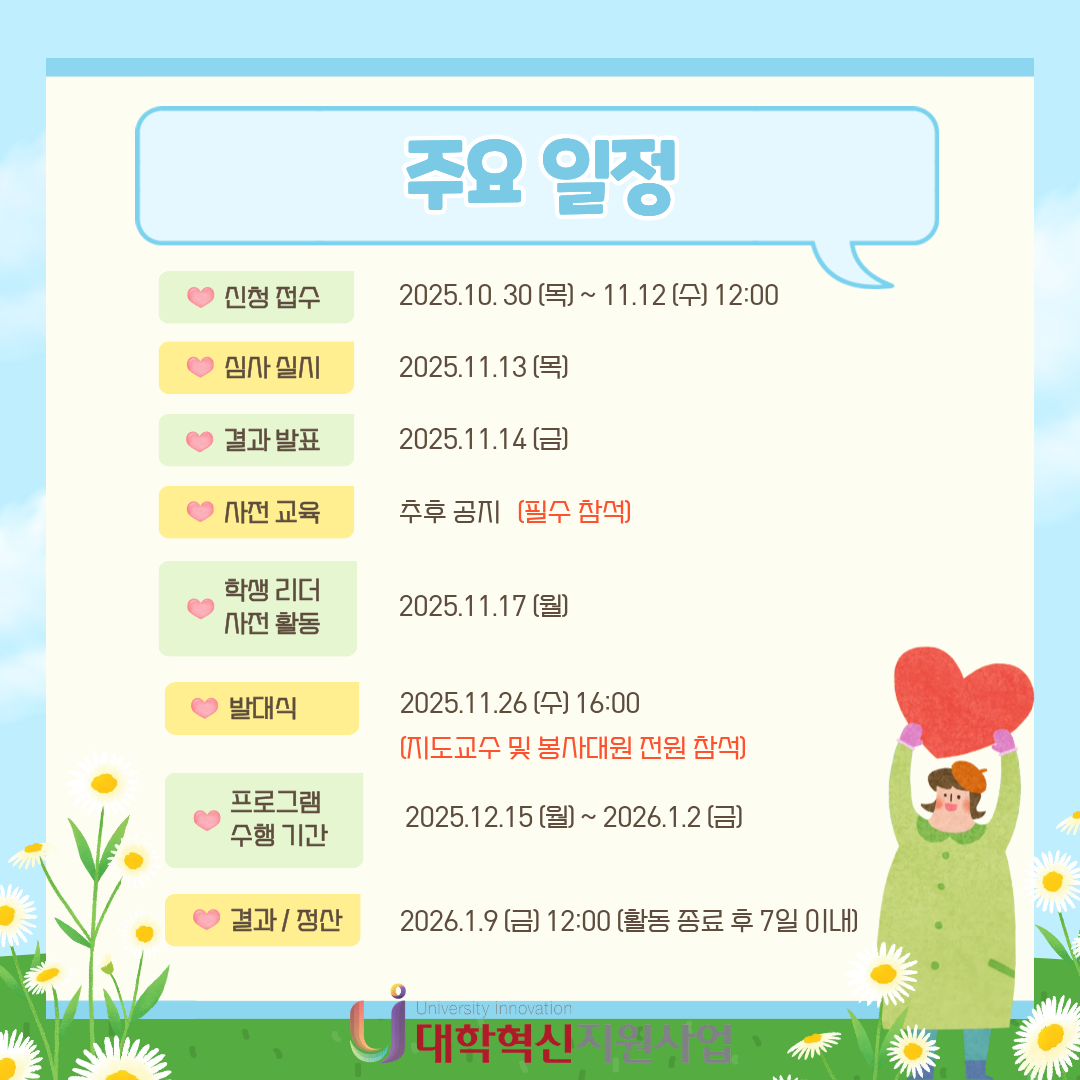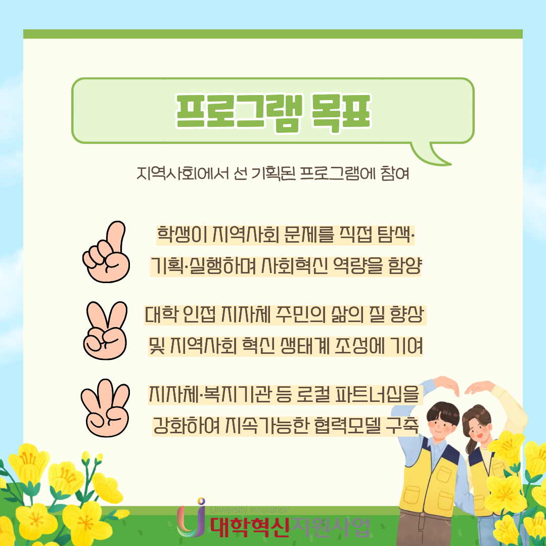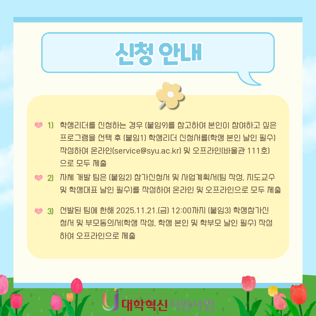 2025 마을 in(人) 마을 Project 참가 안내 본문 목록 이전글MVP 학습법 특강 안내 – 노션을 활용한 스마트한 대학생활 25.11.03 다음글2025 대학혁신지원사업 참여학생 사례영상 경진대회 25.11.03