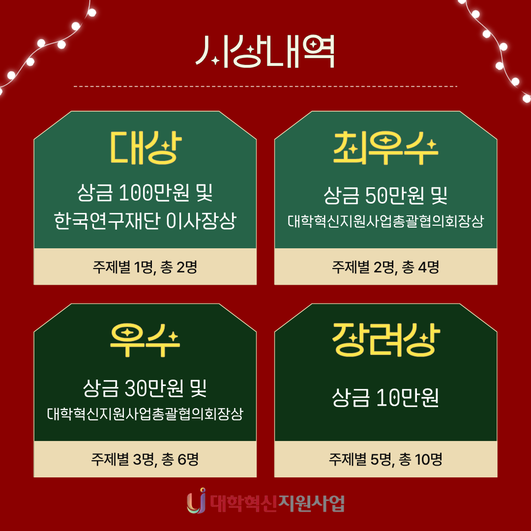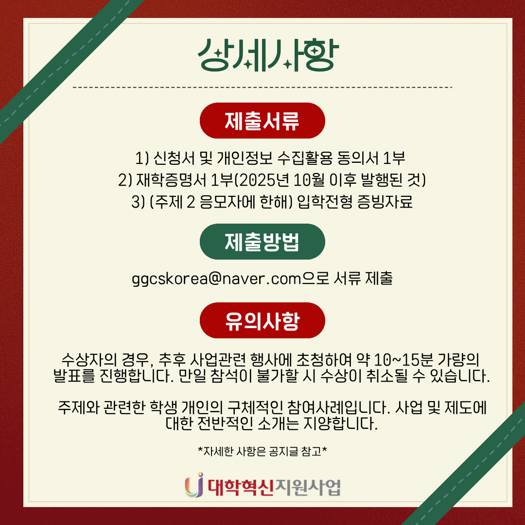 2025년 대학혁신지원사업 학생참여 수기 공모전 개최 본문 목록 이전글2025 대학혁신지원사업 학생성과 발표대회 공모전 25.11.17 다음글2025-2 SU-Festa 25.11.17
