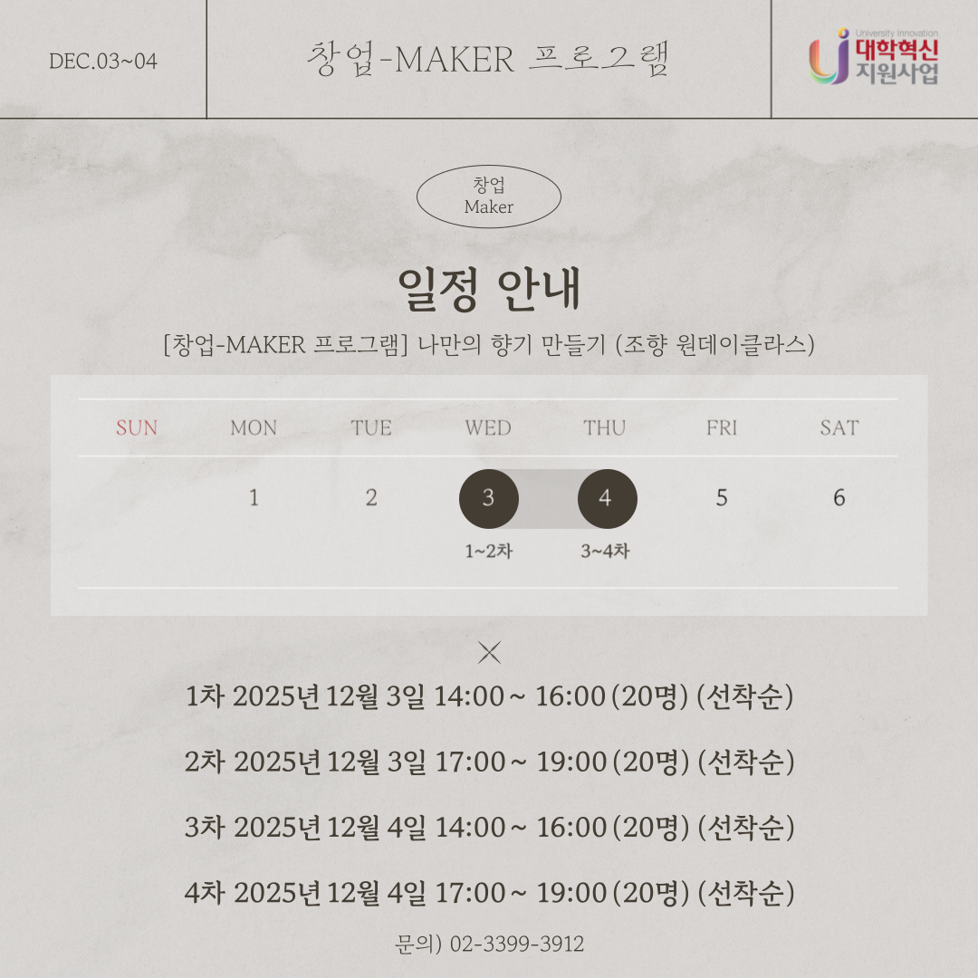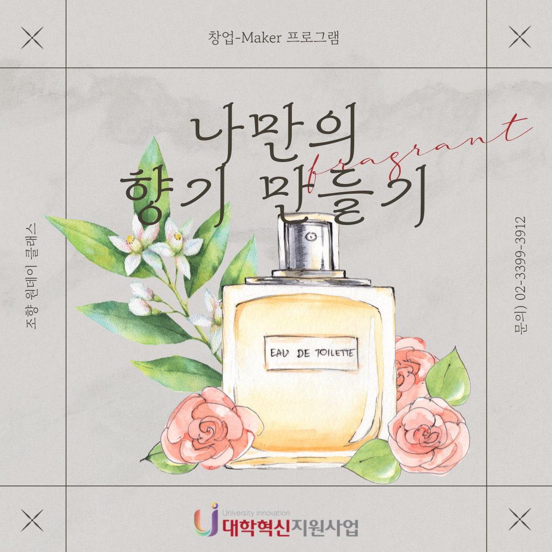 [창업-Maker 프로그램] 나만의 향기 만들기 본문 목록 이전글[창업-Maker 프로그램] 나만의 X스티치 카드지갑 만들기 25.12.02 다음글1인 미디어 비교과프로그램: AI를 활용한 생성형 툴 마스터 과정 프로그램 25.12.01