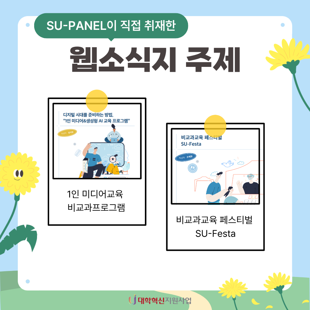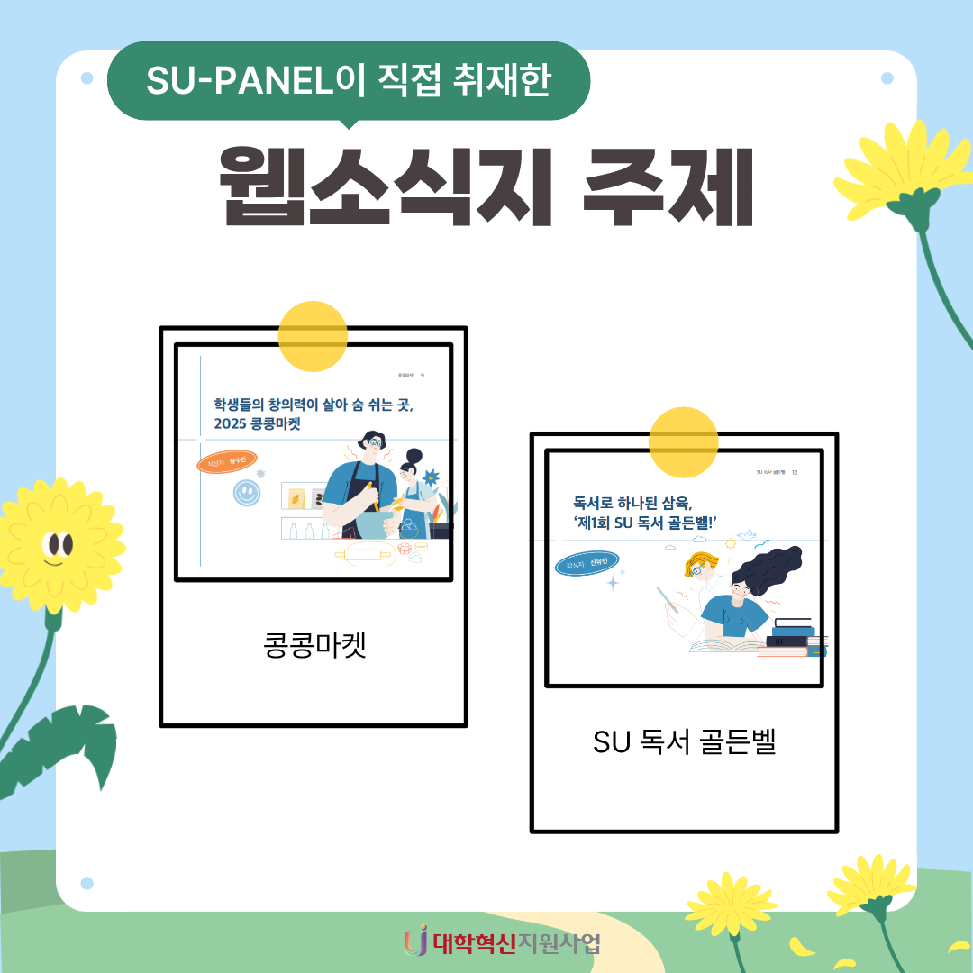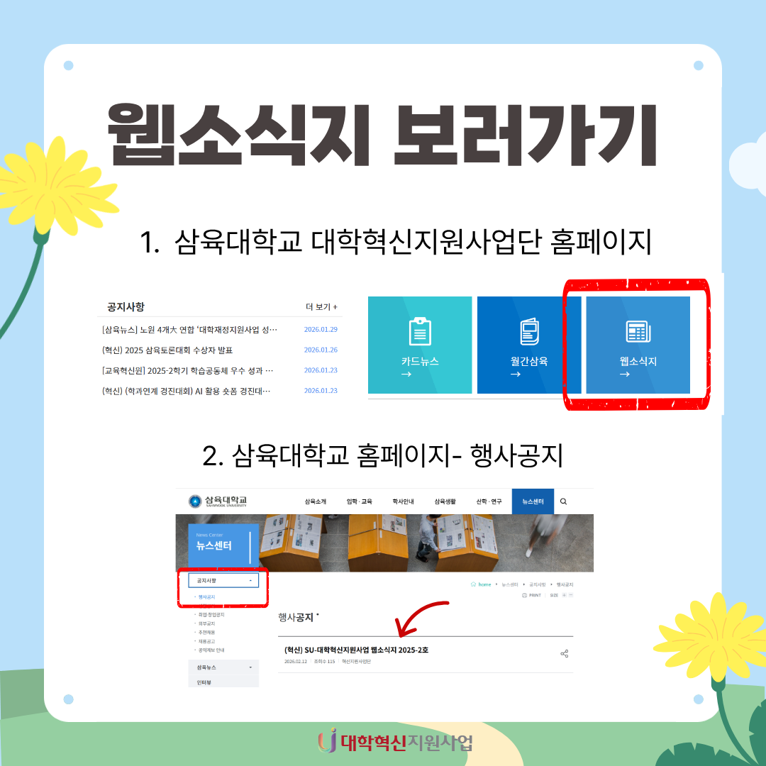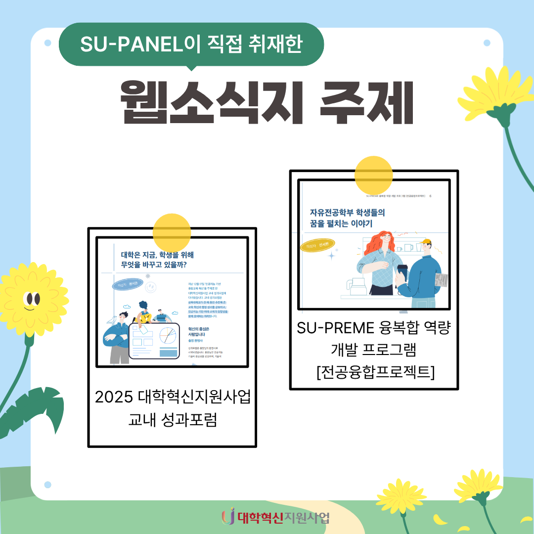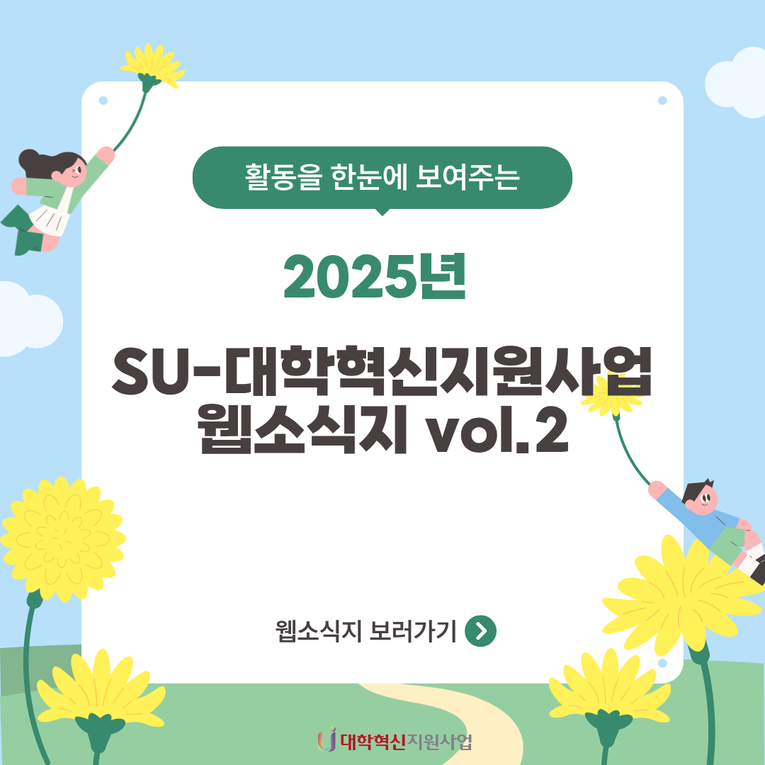 SU-대학혁신지원사업 웹소식지 vol.2 발간 본문 목록 이전글{삼육스케치 vol.7 : 학습공동체} 26.02.24 다음글대학혁신지원사업단 재학생 홍보단 SU-PANEL 모집 26.02.20