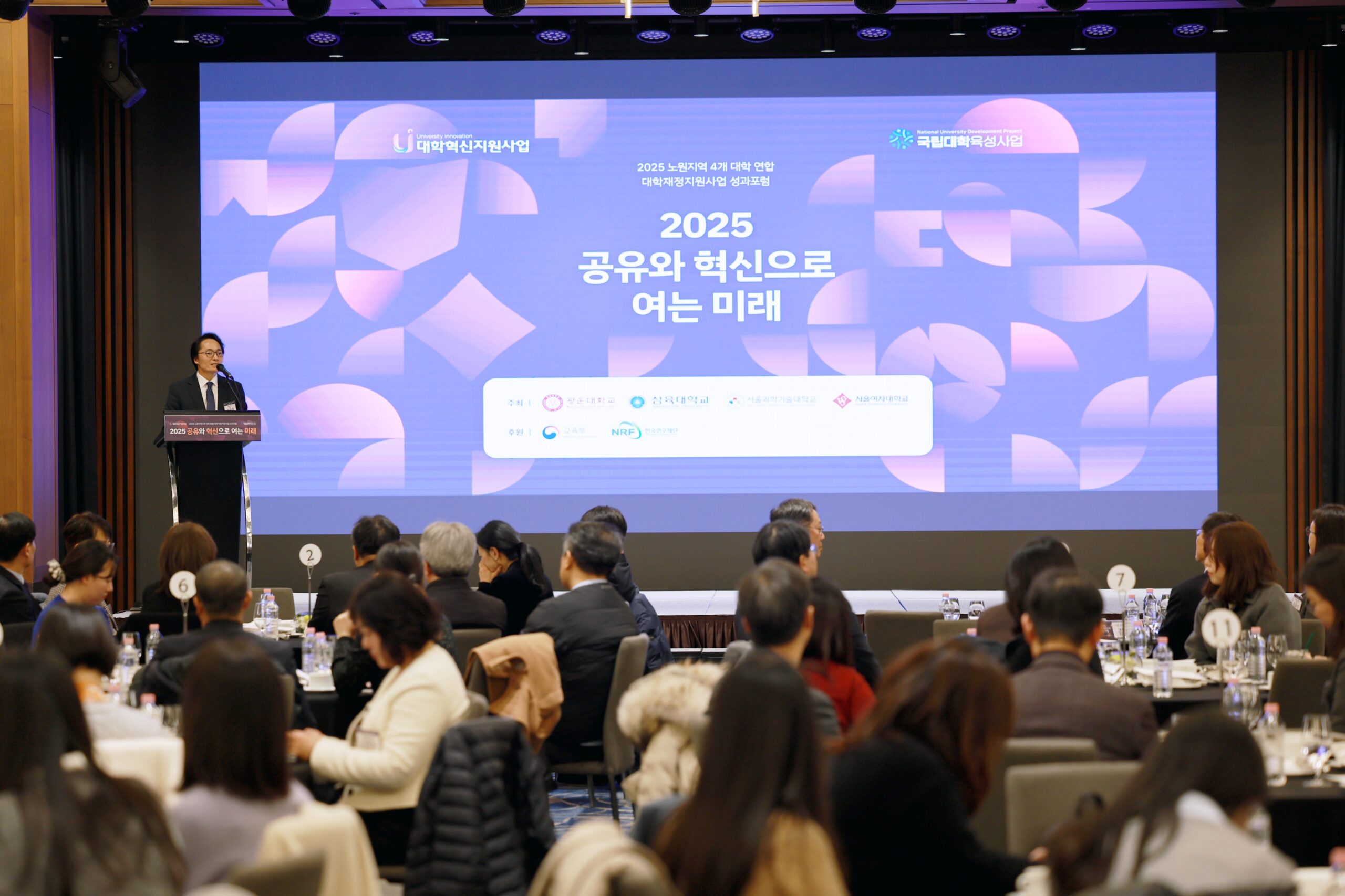 ▲ 제해종 삼육대 총장이 ‘2025 노원지역 4개 대학 연합 대학재정지원사업 성과포럼’에서 환영사를 하고 있다.삼육대는 광운대, 서울과기대, 서울여대 등 서울 노원지역 대학혁신지원사업 및 국립대학육성사업 수행 4개 대학과 함께 ‘2025 대학재정지원사업 연합 성과포럼’을 개최했다.